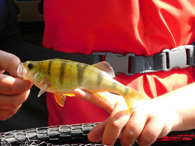 Après la théorie d'usage sur le maniement du float tube, nous avons initiés les deux nouveaux à la pêche de la perche au ver de terre. Il ne leur a pas fallu très longtemps pour tout comprendre et prendre leur première perche pour l'un et un gobie à tache noire pour l'autre.